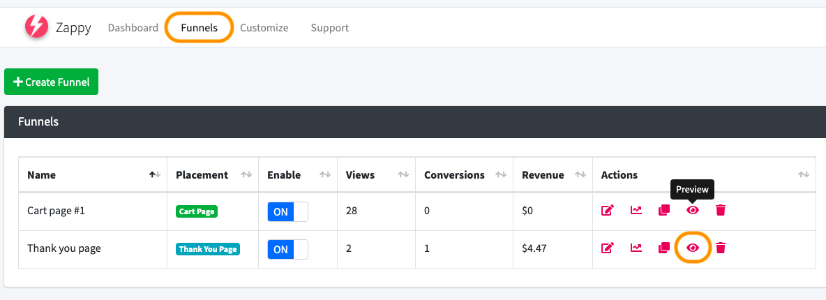 How to preview an Upsell Funnel in Zappy? Navigate to the Funnels tab and click on the 'Eye' icon to preview the Upsell Funnel as shown in the image below. Published 10/03/2020 7:49 pm