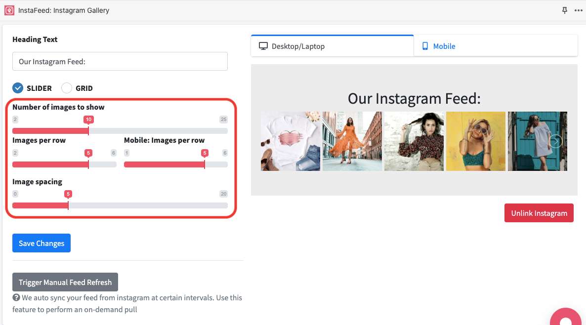 The following items can be customized in the InstaFeed widget through the App's dashboard.