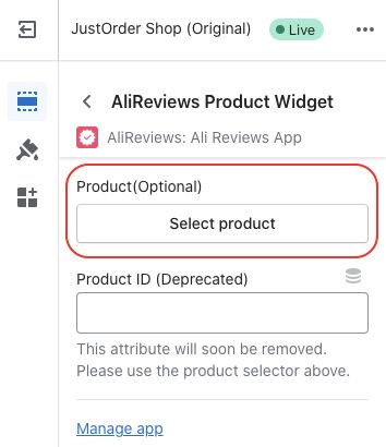 The widget should automatically pick up the product on the page and show its reviews, however, if it doesn't, there is an option to select the product. Just click on the AliReviews Product Widget to select the product.
