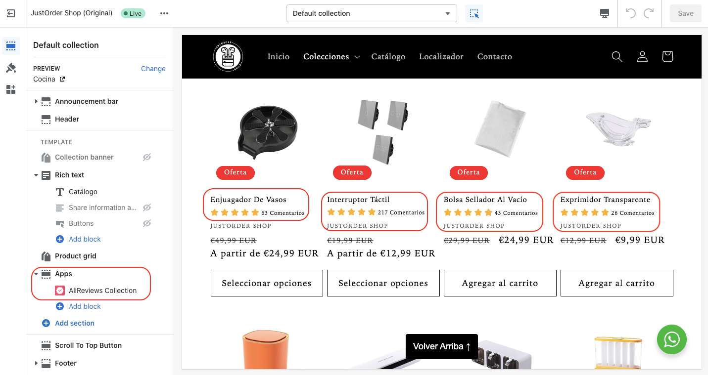 Step 4: Once you add the AliReviews Collections block, the review stars should automatically appear under the products as shown in the image below.