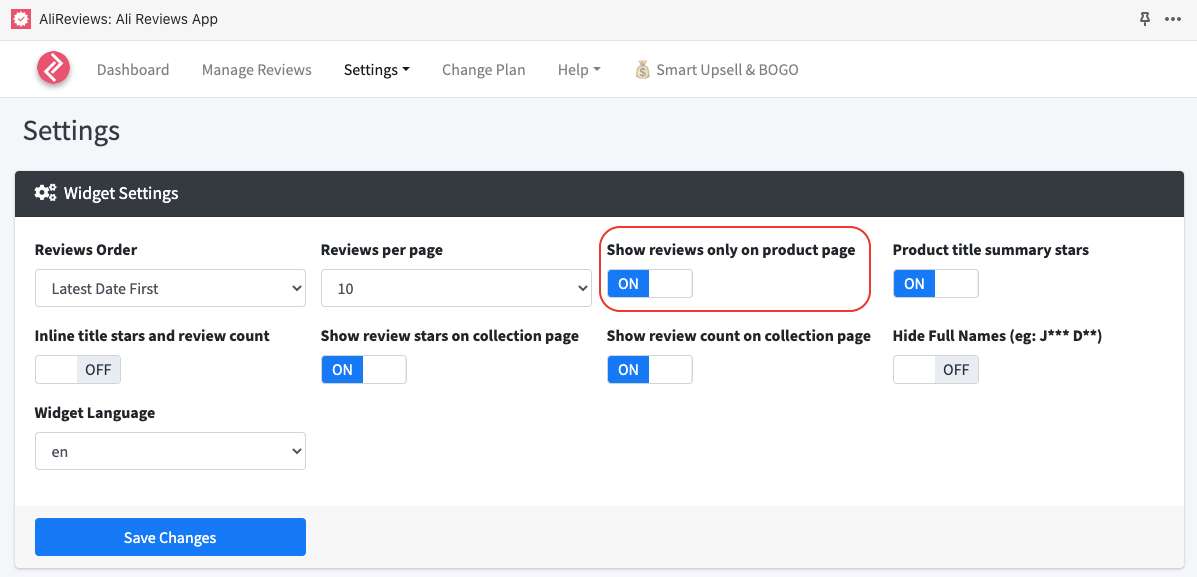 From the AliReviews App Dashboard, navigate to Settings - Widget Settings and Turn ON the Show Reviews Only on Product Page option.