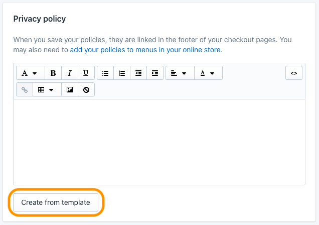 Step 2/3 - Scroll down to the Privacy Policy section. If you don’t have one yet, click on Create from template. If you do have one in place, skip to the next step.
