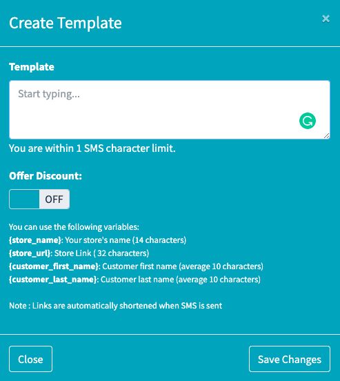 To create the SMS template, scroll down to the Marketing Templates section and click on the '+' sign to create it. The Create Template box will open up as shown below.