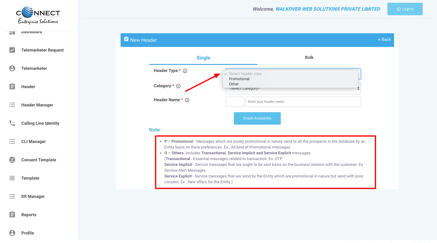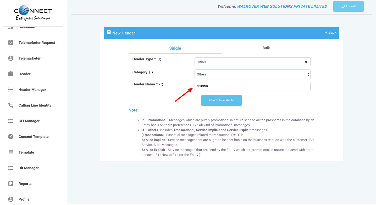 Enter the Header that matches your Registered Company Name or Brand Name (Ex- Apple Inc. will use Sender as iApple) and click on 'check availability':